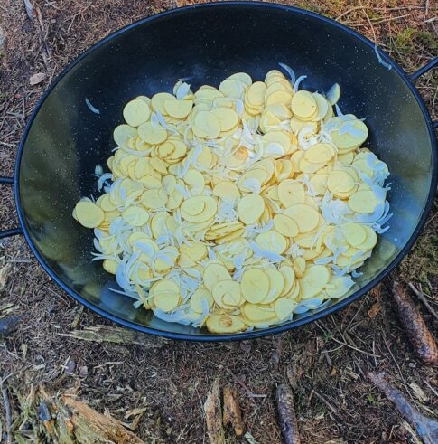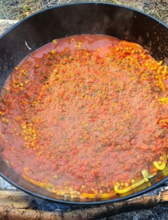 Schicht um Schicht wird die grosse Pfanne gefüllt. 25 hungrige Kursteilnehmende werden bald dem Duft folgen. Davor muss aber noch die Tomatensauce mit reichlich Gewürzen eingekocht werden. Die Tajine dämpft dann langsam auf ganz kleinem Feuer eine gute Stunde vor sich hin.